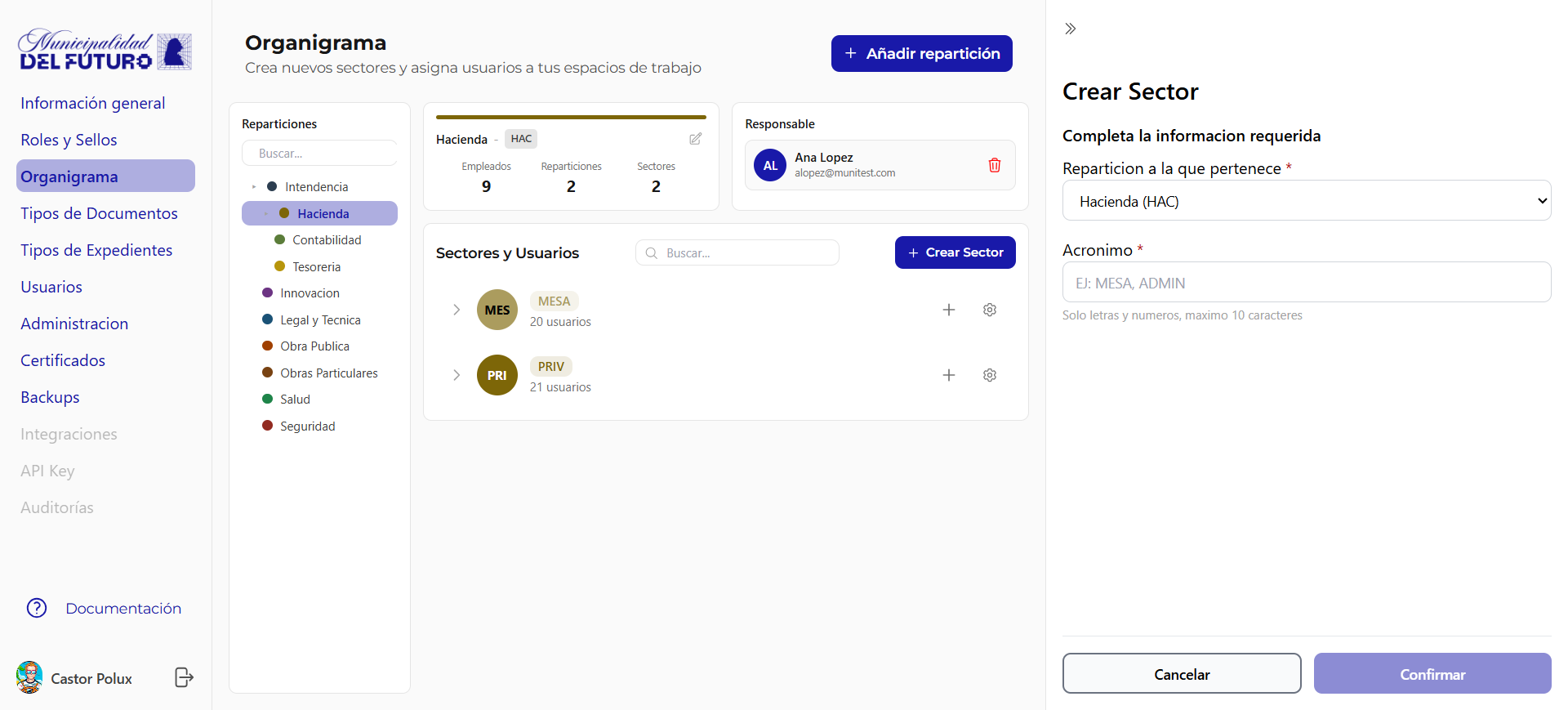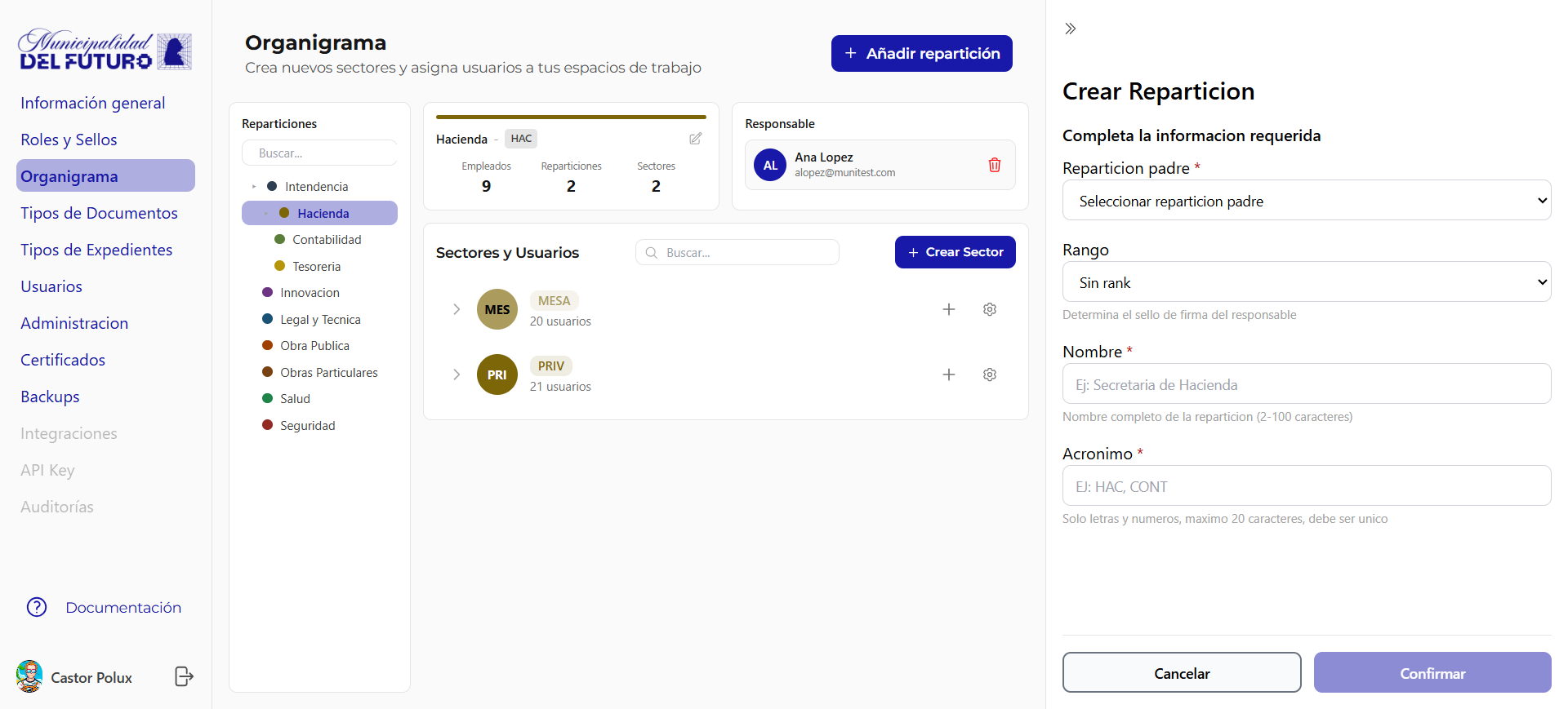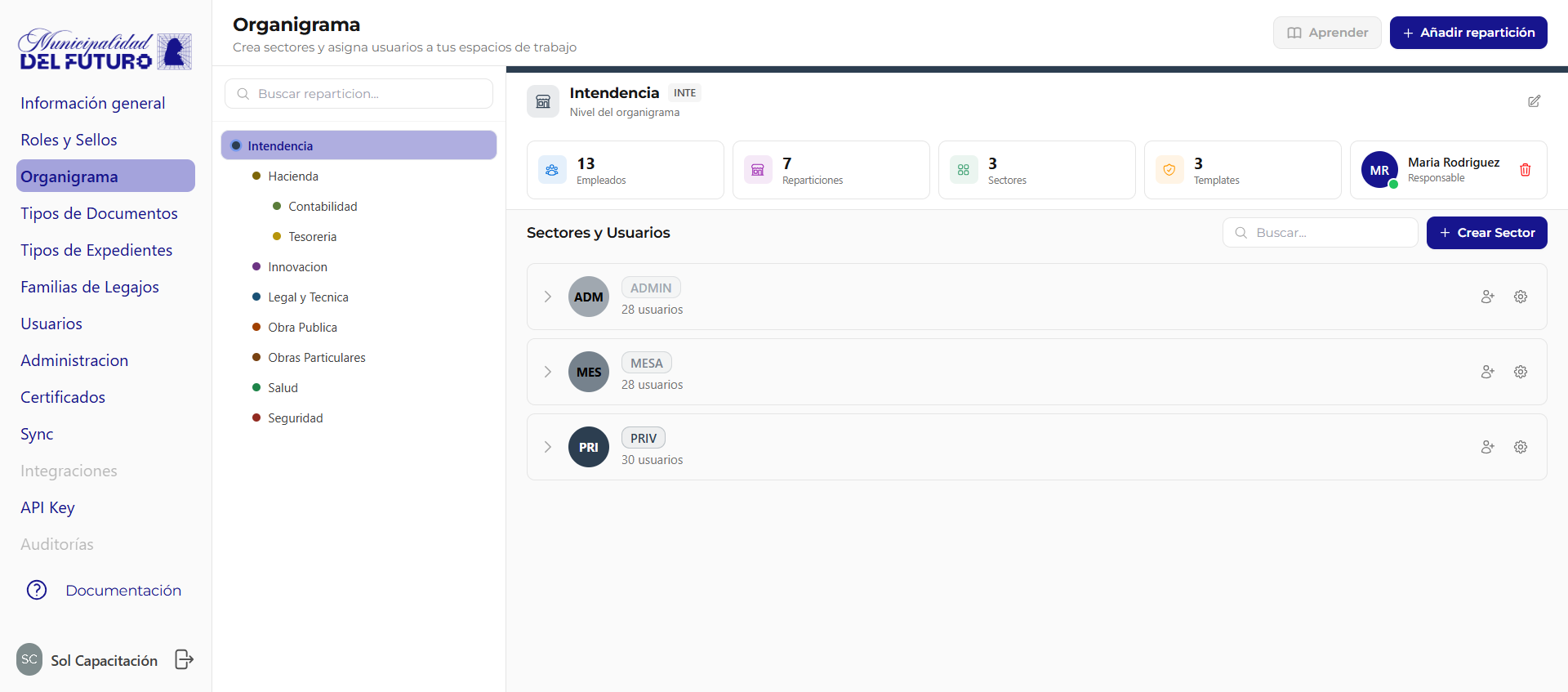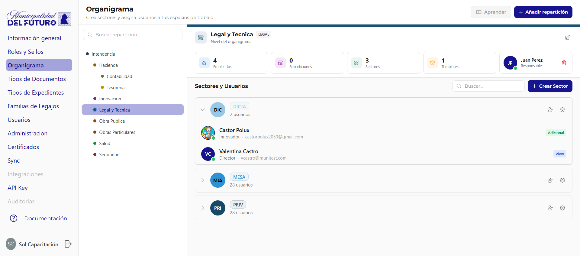 Crea nuevos sectores y asigna usuarios a tus espacios de trabajo. El organigrama define la estructura organizativa de la organizacion: reparticiones (departamentos) y sectores.