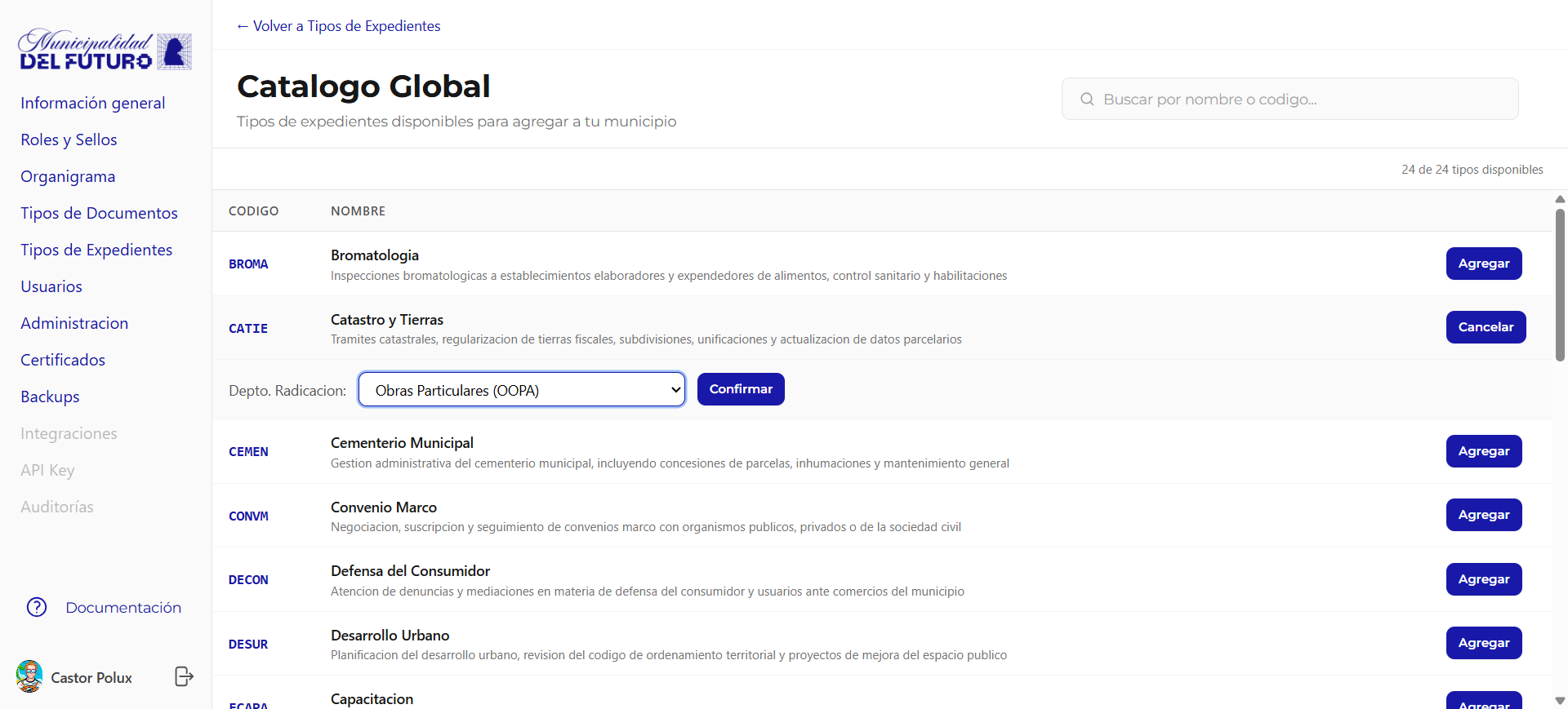 Al agregar un tipo de expediente desde el catalogo global, el sistema solicita seleccionar el Departamento de Radicacion antes de confirmar. Este departamento sera donde se radiquen los expedientes de este tipo.