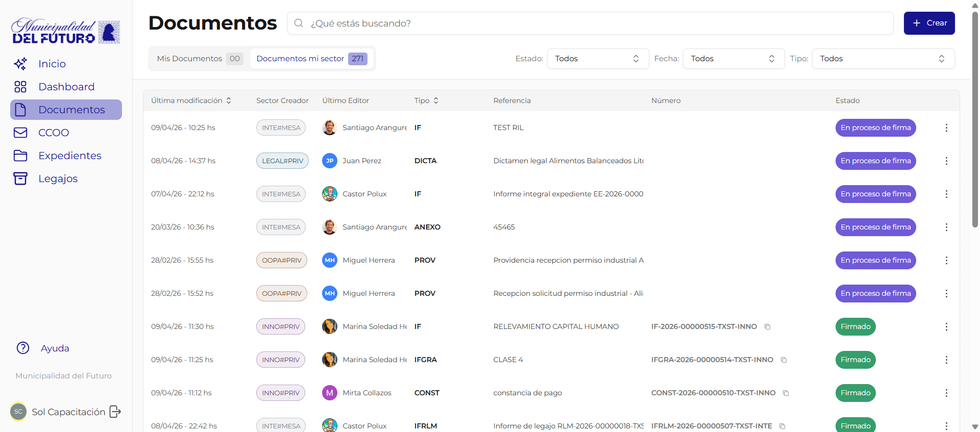 En la esquina superior derecha, el boton "+ Crear" abre el dialogo para crear un nuevo documento. Ver Crear y Editar Documento.