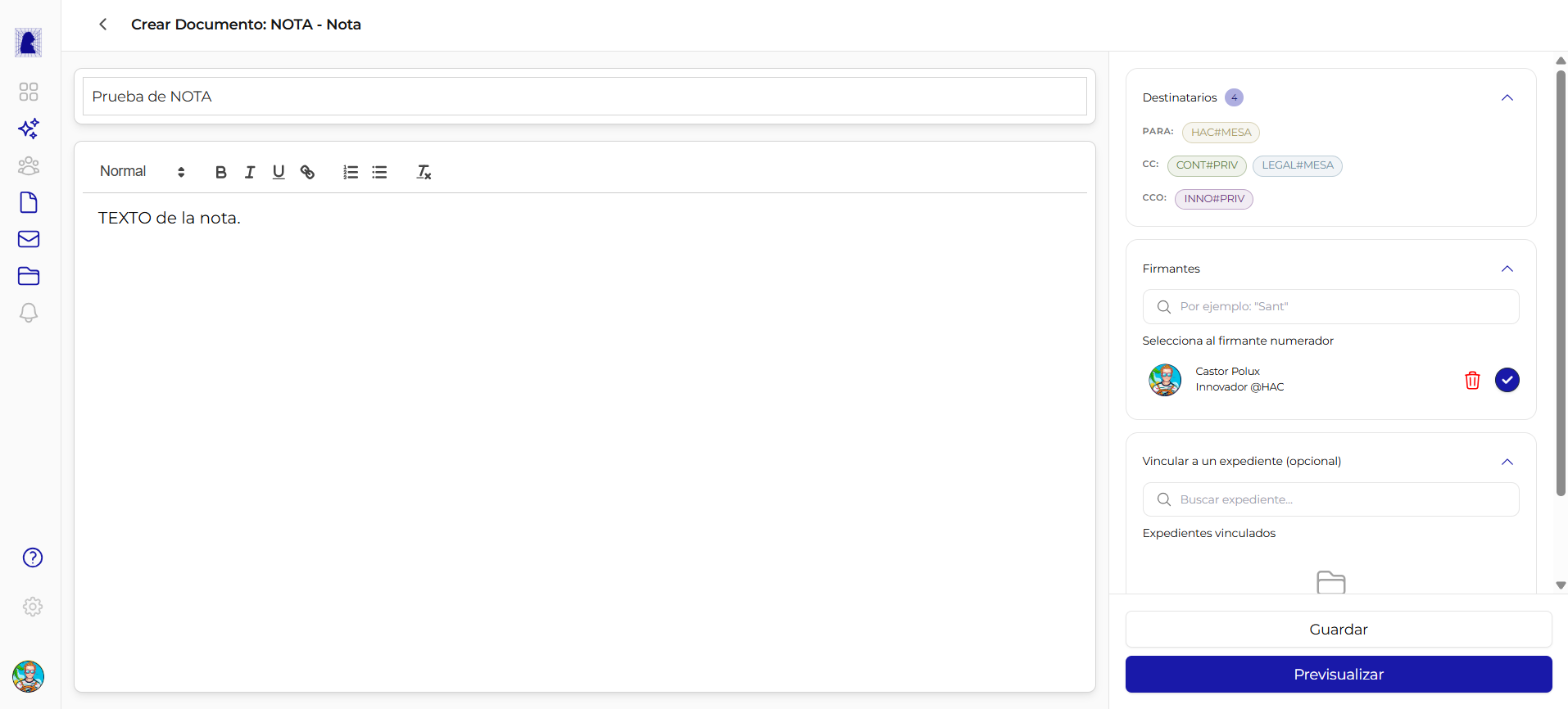 La NOTA es el equivalente digital de un memo o comunicacion interna oficial. Se utiliza para enviar comunicaciones formales entre sectores del organismo. A diferencia de un documento HTML comun, la NOTA incluye una seccion de Destinatarios y el PDF generado muestra los campos PARA, CC y CCO en el encabezado.