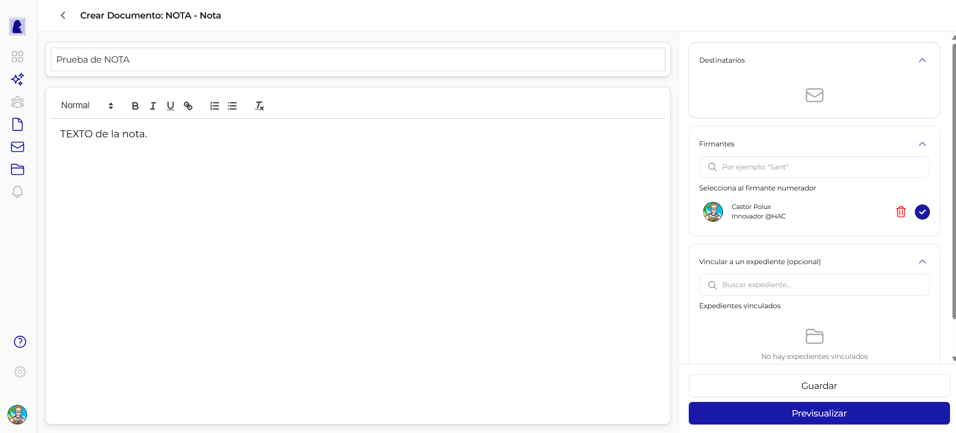 La seccion Destinatarios es la primera seccion del panel lateral, ubicada arriba de Firmantes y Vincular expediente. Solo aparece cuando el tipo de documento es NOTA.