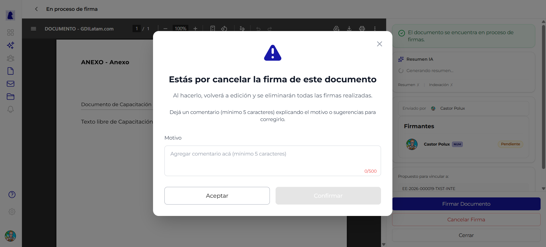 Al confirmar el rechazo, todas las firmas realizadas hasta el momento se eliminan. Cuando el documento se reenvie a firma, todos los firmantes deberan firmar nuevamente desde cero.