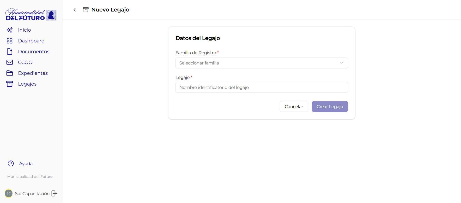 Desde la pantalla principal de Legajos, hace click en el boton "+ Crear". El sistema muestra un selector con las familias de registro disponibles para tu usuario.