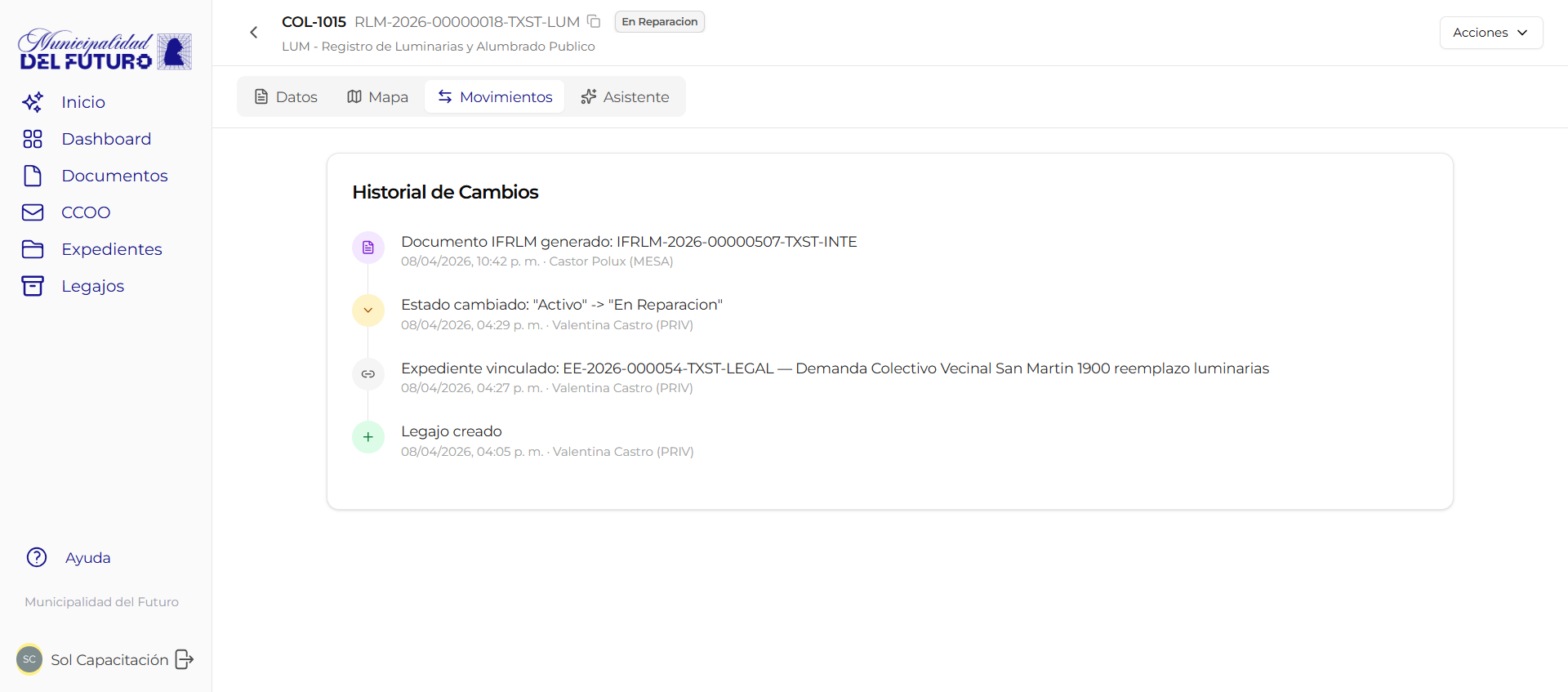 Cada legajo mantiene un historial completo de todas las acciones realizadas sobre el. El historial registra: