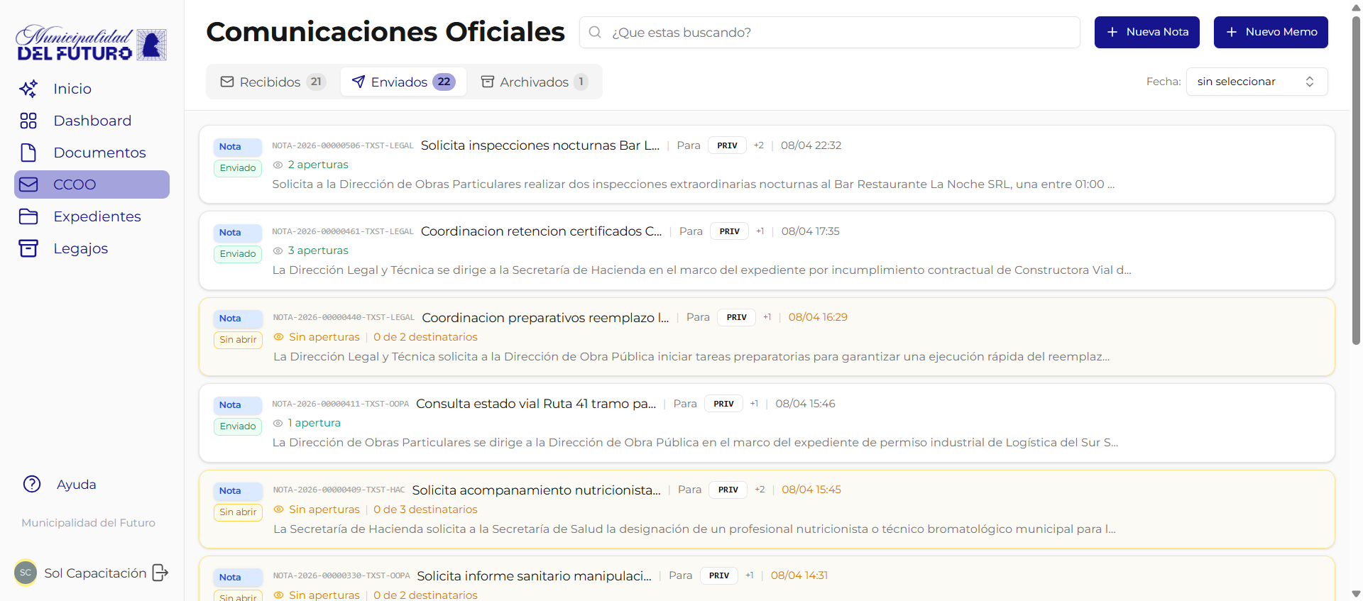 Los Memos son comunicaciones internas privadas persona a persona. A diferencia de las Notas (que se envian entre sectores), los memos se dirigen a usuarios individuales y tienen tracking de lectura.